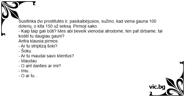 Susitinka dvi prostitutės ir, pasikalbėjusios, sužino, kad viena gauna 100 dolerių, o kita 150 už seksą. Pirmoji sako: