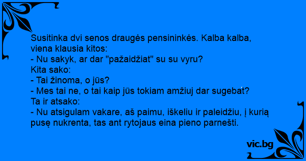 Susitinka dvi senos draugės pensininkės. Kalba kalba, viena klausia kitos: