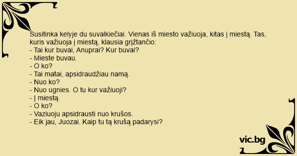 Susitinka kelyje du suvalkiečiai. Vienas iš miesto važiuoja, kitas į miestą. Tas, kuris važiuoja į miestą, klausia grįžtančio: