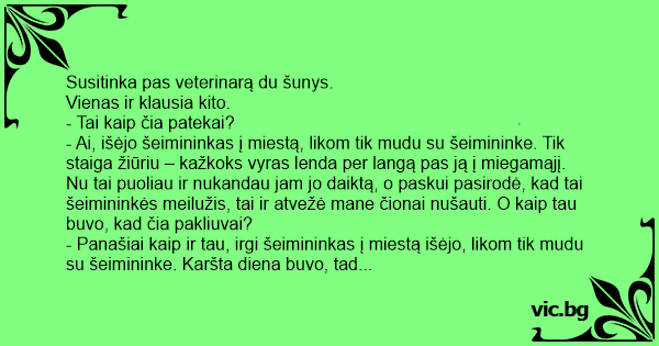 - Ai, išėjo šeimininkas į miestą, likom tik mudu su šeimininke. Tik staiga žiūriu – kažkoks vyras lenda per langą pas ją į miegamąjį. Nu tai puoliau ir nukandau jam jo daiktą, o paskui pasirodė, kad tai šeimininkės meilužis, tai ir atvežė mane čionai nušauti. O kaip tau buvo, kad čia pakliuvai?