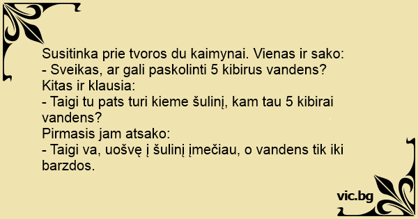 Pas suvalkietį užeina kaimynas ir sako: - Būk žmogus, duok vandens iš savo šulinio porą kibiriukų ? Nu gerai, davė... Po kelių minučių vėl kaimynas: - Būk žmogus, duok vandens iš savo šulinio porą...