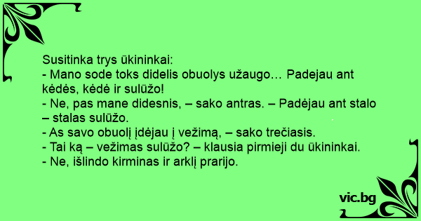 - Tai ką – vežimas sulūžo? – klausia pirmieji du ūkininkai.