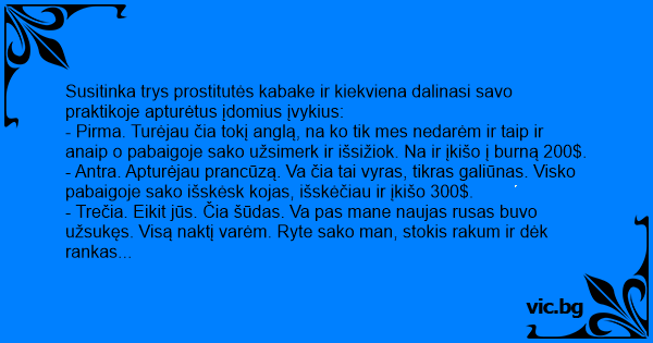 - Trečia. Eikit jūs. Čia šūdas. Va pas mane naujas rusas buvo užsukęs. Visą naktį varėm. Ryte sako man, stokis rakum ir dėk rankas prie subinės. Na aš taip ir padariau. O jis išsitraukė credit card ir perbraukia per subinę rėkdamas „Oplačeno“