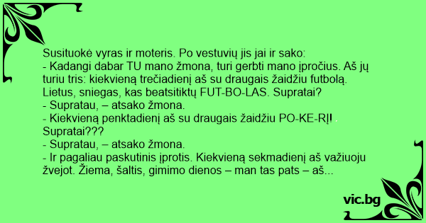 Susituokė vyras ir moteris. Po vestuvių jis jai ir sako: