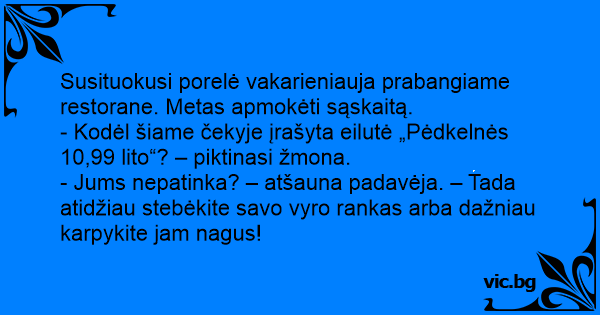 - Jums nepatinka? – atšauna padavėja. – Tada atidžiau stebėkite savo vyro rankas arba dažniau karpykite jam nagus!