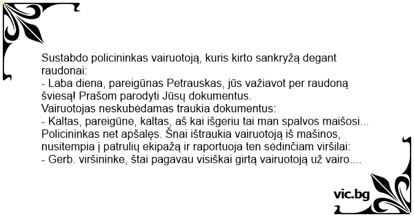 - Laba diena, pareigūnas Petrauskas, jūs važiavot per raudoną šviesą! Prašom parodyti Jūsų dokumentus.