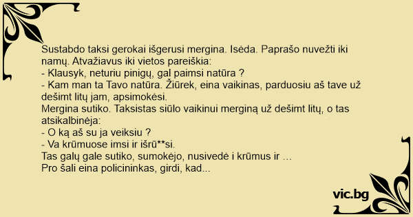 Mergina sutiko. Taksistas siūlo vaikinui merginą už dešimt litų, o tas atsikalbinėja: