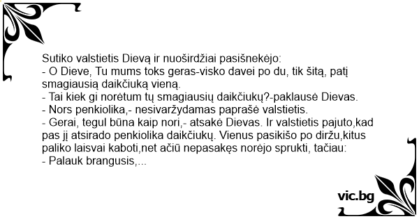 - Gerai, tegul būna kaip nori,- atsakė Dievas. Ir valstietis pajuto,kad pas jį atsirado penkiolika daikčiukų. Vienus pasikišo po diržu,kitus paliko laisvai kaboti,net ačiū nepasakęs norėjo sprukti, tačiau: