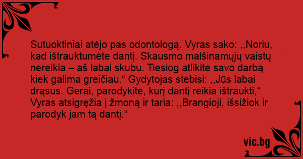Sutuoktiniai atėjo pas odontologą. Vyras sako: ,,Noriu, kad ištrauktumėte dantį. Skausmo malšinamųjų vaistų nereikia – aš labai skubu. Tiesiog atlikite savo darbą kiek galima greičiau.“ Gydytojas stebisi: ,,Jūs labai drąsus. Gerai, parodykite, kurį dantį reikia ištraukti,“ Vyras atsigręžia į žmoną ir taria: ,,Brangioji, išsižiok ir parodyk jam tą dantį.“