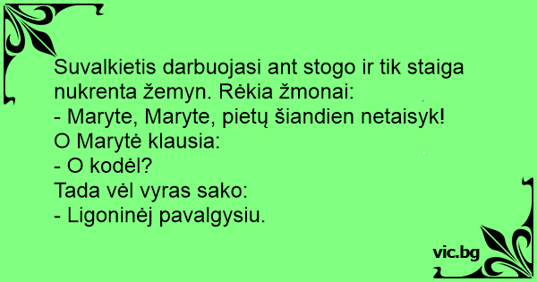Suvalkietis darbuojasi ant stogo ir tik staiga nukrenta žemyn. Rėkia žmonai: