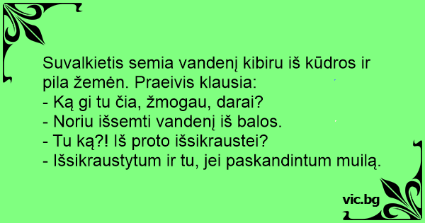 Suvalkietis semia vandenį kibiru iš kūdros ir pila žemėn. Praeivis klausia: