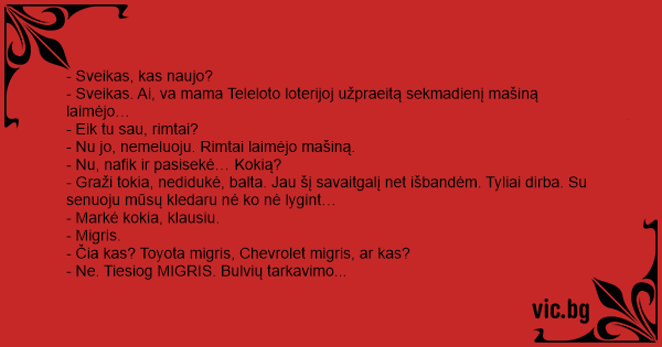- Sveikas. Ai, va mama Teleloto loterijoj užpraeitą sekmadienį mašiną laimėjo…