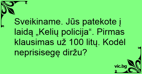 Sveikiname. Jūs patekote į laidą „Kelių policija“. Pirmas klausimas už 100 litų. Kodėl neprisisegę diržu?