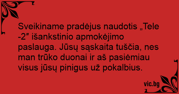 Sveikiname pradėjus naudotis „Tele-2″ išankstinio apmokėjimo paslauga. Jūsų sąskaita tuščia, nes man trūko duonai ir aš pasiėmiau visus jūsų pinigus už pokalbius.