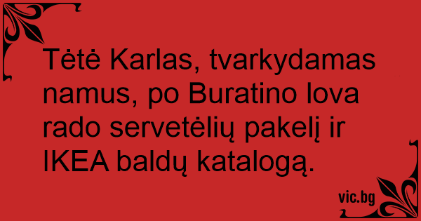 Tėtė Karlas, tvarkydamas namus, po Buratino lova rado servetėlių pakelį ir IKEA baldų katalogą.