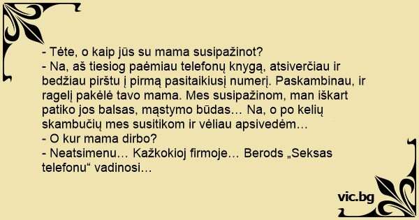 - Na, aš tiesiog paėmiau telefonų knygą, atsiverčiau ir bedžiau pirštu į pirmą pasitaikiusį numerį. Paskambinau, ir ragelį pakėlė tavo mama. Mes susipažinom, man iškart patiko jos balsas, mąstymo būdas… Na, o po kelių skambučių mes susitikom ir vėliau apsivedėm…