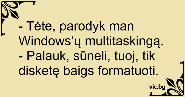 - Tėte, parodyk man Windows’ų multitaskingą. - Palauk, sūneli, tuoj, tik disketę baigs formatuoti.