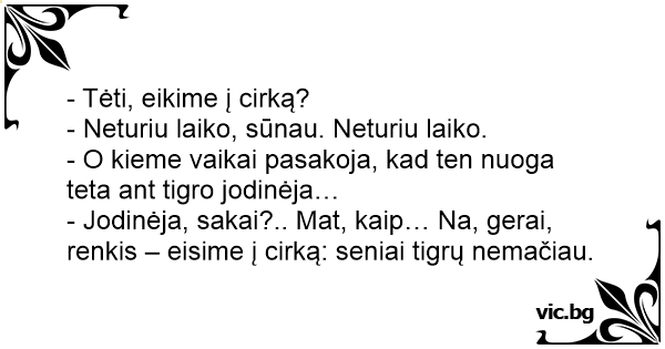 - Jodinėja, sakai?.. Mat, kaip… Na, gerai, renkis – eisime į cirką: seniai tigrų nemačiau.