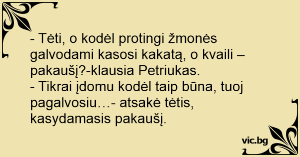 - Tėti, o kodėl protingi žmonės galvodami kasosi kakatą, o kvaili – pakaušį?-klausia Petriukas.