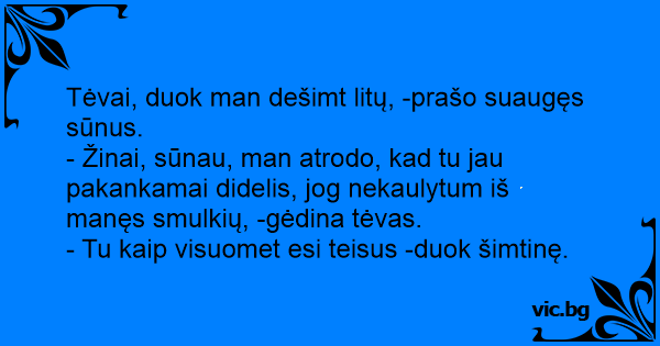 - Žinai, sūnau, man atrodo, kad tu jau pakankamai didelis, jog nekaulytum iš manęs smulkių, -gėdina tėvas.