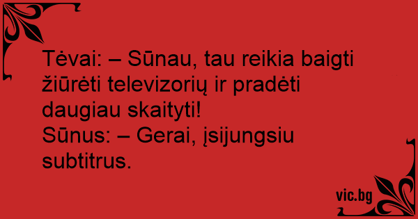 Tėvai: – Sūnau, tau reikia baigti žiūrėti televizorių ir pradėti daugiau skaityti!