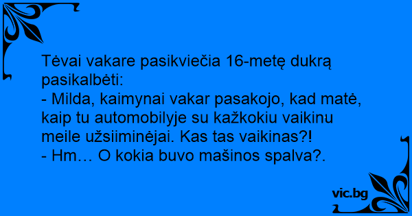 - Milda, kaimynai vakar pasakojo, kad matė, kaip tu automobilyje su kažkokiu vaikinu meile užsiiminėjai. Kas tas vaikinas?!