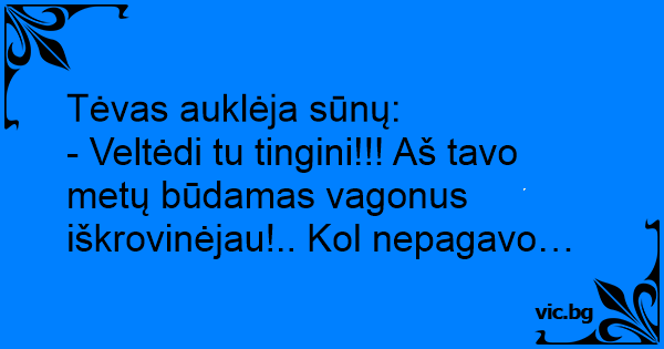 - Veltėdi tu tingini!!! Aš tavo metų būdamas vagonus iškrovinėjau!.. Kol nepagavo…