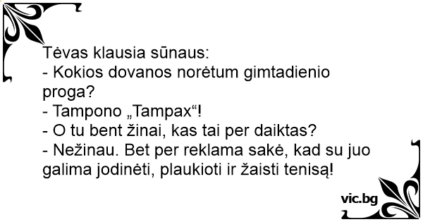 Hvad ønsker du dig til din fødselsdag ? spørger moderen sin 10-årige søn. - En tampax, svarer drengen. - Hvorfor ønsker du dig en tampax ? spørger moderen forundret. - Jah..., jeg ved jo godt nok...