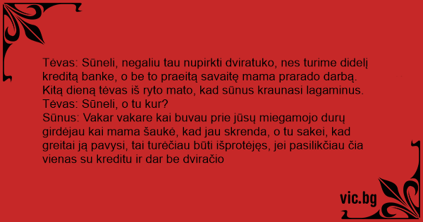 Sūnus: Vakar vakare kai buvau prie jūsų miegamojo durų girdėjau kai mama šaukė, kad jau skrenda, o tu sakei, kad greitai ją pavysi, tai turėčiau būti išprotėjęs, jei pasilikčiau čia vienas su kreditu ir dar be dviračio
