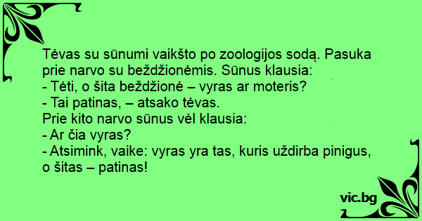 Tėvas su sūnumi vaikšto po zoologijos sodą. Pasuka prie narvo su beždžionėmis. Sūnus klausia: