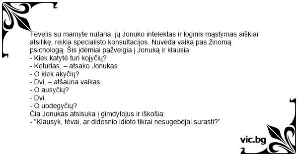 Tėvelis su mamyte nutaria: jų Jonuko intelektas ir loginis mąstymas aiškiai atsilikę, reikia specialisto konsultacijos. Nuveda vaiką pas žinomą psichologą. Šis įdėmiai pažvelgia į Jonuką ir klausia: