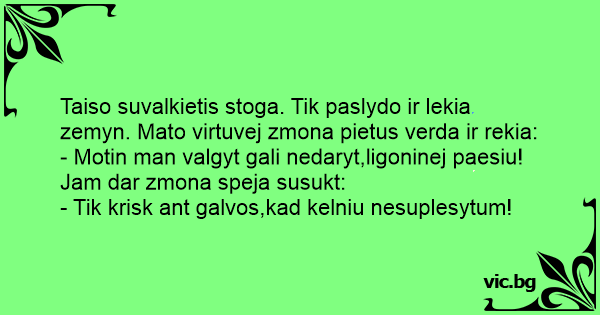 Taiso suvalkietis stoga. Tik paslydo ir lekia zemyn. Mato virtuvej zmona pietus verda ir rekia: