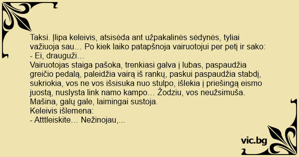 Taksi. Įlipa keleivis, atsisėda ant užpakalinės sėdynės, tyliai važiuoja sau… Po kiek laiko patapšnoja vairuotojui per petį ir sako: