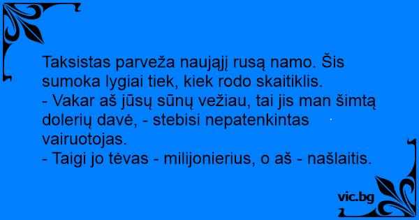 Taksistas parveža naująjį rusą namo. Šis sumoka lygiai tiek, kiek rodo skaitiklis.