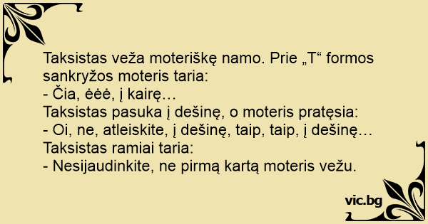 Taksistas veža moteriškę namo. Prie „T“ formos sankryžos moteris taria: