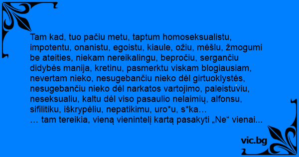 Tam kad, tuo pačiu metu, taptum homoseksualistu, impotentu, onanistu, egoistu, kiaule, ožiu, mėšlu, žmogumi be ateities, niekam nereikalingu, bepročiu, sergančiu didybės manija, kretinu, pasmerktu viskam blogiausiam, nevertam nieko, nesugebančiu nieko dėl girtuoklystės, nesugebančiu nieko dėl narkatos vartojimo, paleistuviu, neseksualiu, kaltu dėl viso pasaulio nelaimių, alfonsu, sifilitiku, iškrypėliu, nepatikimu, uro*u, s*ka…