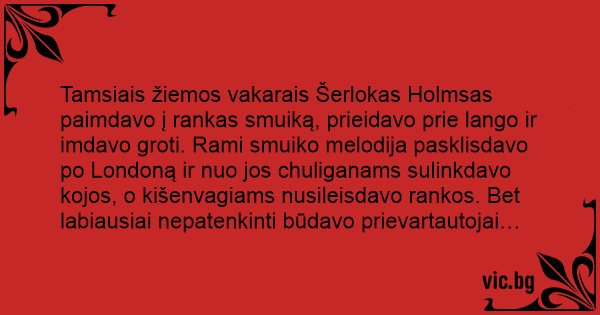 Tamsiais žiemos vakarais Šerlokas Holmsas paimdavo į rankas smuiką, prieidavo prie lango ir imdavo groti. Rami smuiko melodija pasklisdavo po Londoną ir nuo jos chuliganams sulinkdavo kojos, o kišenvagiams nusileisdavo rankos. Bet labiausiai nepatenkinti būdavo prievartautojai…