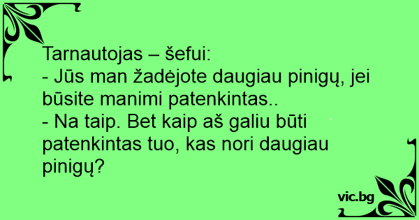 Tarnautojas – šefui: - Jūs man žadėjote daugiau pinigų, jei būsite manimi patenkintas.. - Na taip. Bet kaip aš galiu būti patenkintas tuo, kas nori daugiau pinigų?