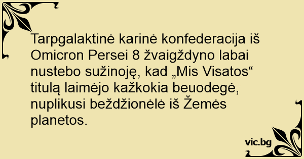 Tarpgalaktinė karinė konfederacija iš Omicron Persei 8 žvaigždyno labai nustebo sužinoję, kad „Mis Visatos“ titulą laimėjo kažkokia beuodegė, nuplikusi beždžionėlė iš Žemės planetos.