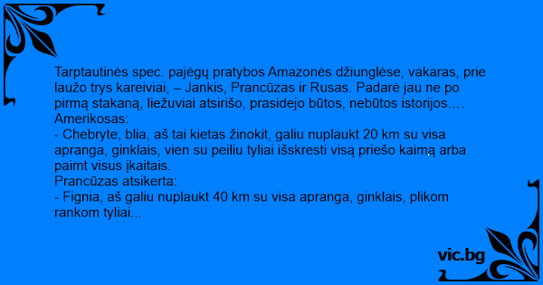 Tarptautinės spec. pajėgų pratybos Amazonės džiunglėse, vakaras, prie laužo trys kareiviai, – Jankis, Prancūzas ir Rusas. Padarė jau ne po pirmą stakaną, liežuviai atsirišo, prasidejo būtos, nebūtos istorijos….