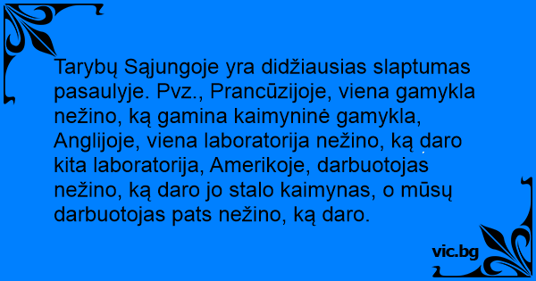 Tarybų Sąjungoje yra didžiausias slaptumas pasaulyje. Pvz., Prancūzijoje, viena gamykla nežino, ką gamina kaimyninė gamykla, Anglijoje, viena laboratorija nežino, ką daro kita laboratorija, Amerikoje, darbuotojas nežino, ką daro jo stalo kaimynas, o mūsų darbuotojas pats nežino, ką daro.