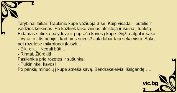 Tarybinai laikai. Traukinio kupe važiuoja 3-se. Kaip visada – butelis ir valdžios keikimas. Po kažkiek laiko vienas atsistoja ir išeina į tualetą. Eidamas sutinka palydovę ir paprašo kavos į kupe. Grįžta atgal ir sako:
