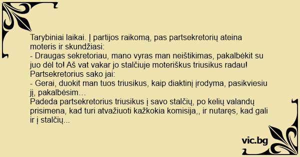 Tarybiniai laikai. Į partijos raikomą, pas partsekretorių ateina moteris ir skundžiasi: