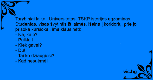 Tarybiniai laikai. Universitetas. TSKP istorijos egzaminas. Studentas, visas švytintis iš laimės, išeina į koridorių, prie jo prišoka kursiokai, ima klausinėti: