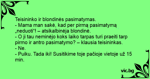 - O ji tau neminėjo koks laiko tarpas turi praeiti tarp pirmo ir antro pasimatymo? – klausia teisininkas.