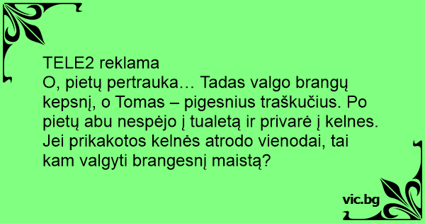 O, pietų pertrauka… Tadas valgo brangų kepsnį, o Tomas – pigesnius traškučius. Po pietų abu nespėjo į tualetą ir privarė į kelnes. Jei prikakotos kelnės atrodo vienodai, tai kam valgyti brangesnį maistą?