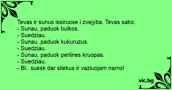 Отишли баща и син за риба, да ама не кълве и не кълве...Бащата се обърнал към сина: - Синко я дай от чантата сандвичите дето майкати ги сложи за закуска да закусим и тъй и тъй не кълве! Синът...