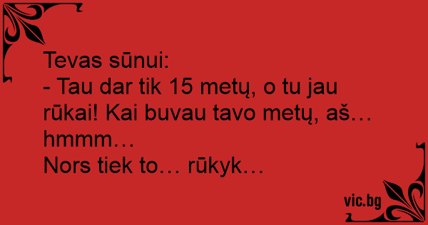 - Tau dar tik 15 metų, o tu jau rūkai! Kai buvau tavo metų, aš… hmmm…