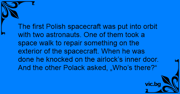 The first Polish spacecraft was put into orbit with two astronauts. One of them took a space walk to repair something on the exterior of the spacecraft. When he was done he knocked on the airlock’s inner door. And the other Роlаск asked, „Who’s there?“