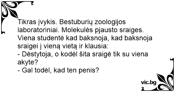 Tikras įvykis. Bestuburių zoologijos laboratoriniai. Molekulės pjausto sraiges. Viena studentė kad baksnoja, kad baksnoja sraigei į vieną vietą ir klausia: